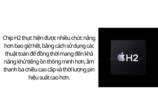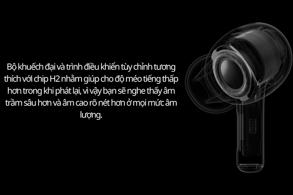 Chip H2 do Apple thiết kế là sức mạnh đằng sau AirPods Pro 2 và hiệu năng âm thanh tiên tiến của sản phẩm này. Chip hoạt động đồng thời với bộ khuếch đại và trình điều khiển tùy chỉnh giúp mang đến những nốt cao rõ ràng, trong trẻo và âm trầm sâu lắng, đầy đặn đến bất ngờ. Vì thế mọi âm thanh đều ấn tượng hơn bao giờ hết.
