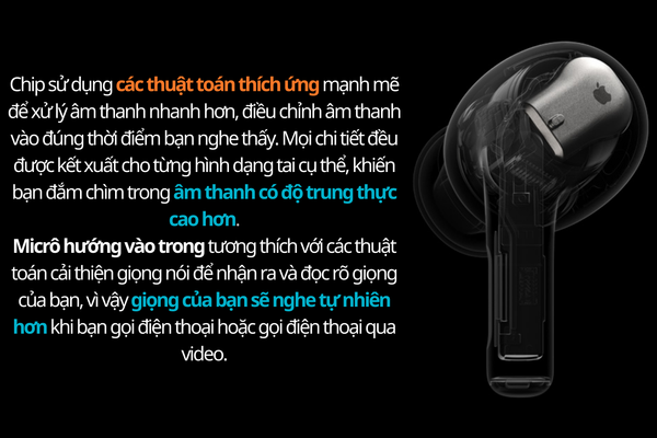 Được tiếp thêm sức mạnh của chip H2, AirPods Pro 2 nay sở hữu Âm Thanh Thích Ứng có chức năng tự động ưu tiên các âm thanh cần bạn chú ý khi bạn đi khắp nơi. Nhờ sự kết hợp mượt mà giữa tính năng Chủ Động Khử Tiếng Ồn đẳng cấp pro và chế độ Xuyên Âm khi cần thiết, Âm Thanh Thích Ứng mang đến sự hòa quyện âm thanh đích thực cho mọi môi trường một cách diệu kỳ