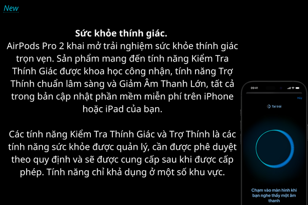 Các tính năng Kiểm Tra Thính Giác và Trợ Thính là các tính năng sức khỏe được quản lý, cần được phê duyệt và sẽ được cung cấp sau khi được cấp phép. Tính năng chỉ khả dụng ở một số khu vực.