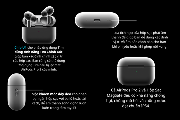 Hộp Sạc MagSafe được trang bị nhiều tính năng khiến bạn vừa nghe vừa di chuyển vô cùng thuận tiện. Hộp sạc có nhiều cách theo dõi vị trí của chính nó hữu ích hơn, thời lượng pin dài hơn để bạn nghe, xem và nói chuyện lâu hơn giữa các lần sạc. Không có hộp sạc nào đa năng hơn thế.