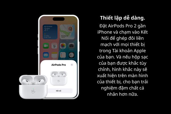 AirPods Pro 2 đưa trải nghiệm nghe lên tầm cao mới ở cấp độ cá nhân. Âm Thanh Không Gian Cá Nhân Hóa với tính năng theo dõi chuyển động đầu chủ động tương thích với tất cả các thiết bị của bạn, cho bạn đắm chìm sâu hơn vào âm thanh bao phủ khi bạn nghe nhạc, xem phim hoặc chơi game. Và EQ Thích Ứng đảm bảo cho độ vừa tai của AirPods Pro 2, vậy nên từng tần số bạn nghe thấy sẽ thật phù hợp với bạn.