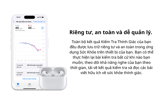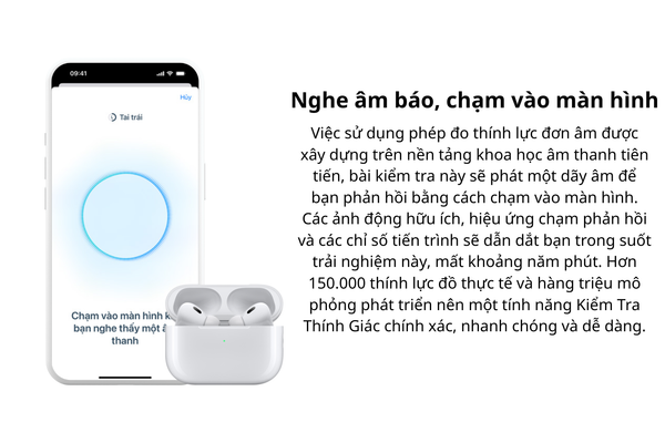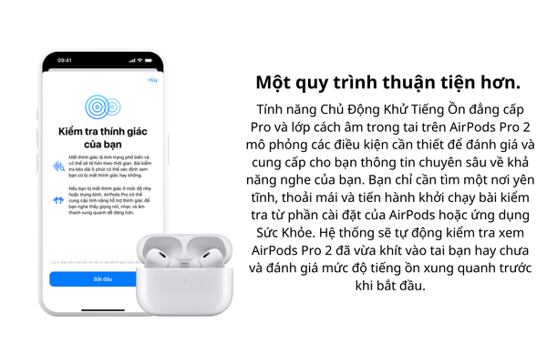 Thực hiện Kiểm Tra Thính Giác, sử dụng tính năng Trợ Thính và Giảm Âm Thanh Lớn chỉ với AirPods Pro 2 ghép đôi với iPhone hoặc iPad. Đây là trải nghiệm sức khỏe thính giác trọn vẹn, khả dụng trong một bản cập nhật phần mềm miễn phí.