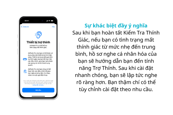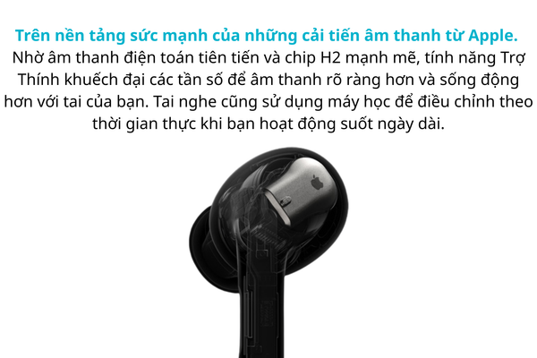AirPods và trợ năngCác tính năng như Tăng Cường Hội Thoại tập trung vào giọng nói ngay trước mặt bạn. Tính năng Thích Nghi Tai Nghe khuếch đại các tần số bạn có thể cần nghe rõ. Nếu bạn cần tập trung vào một diễn giả khách mời trong một khán phòng náo nhiệt, tính năng Nghe Trực Tiếp phối hợp với iPhone của bạn để chọn lấy âm thanh từ xa. Và đối với tình trạng mất thính giác từ mức nhẹ đến trung bình, bạn có thể sử dụng AirPods Pro 2 như một thiết bị có tính năng Trợ Thính chuẩn lâm sàng.