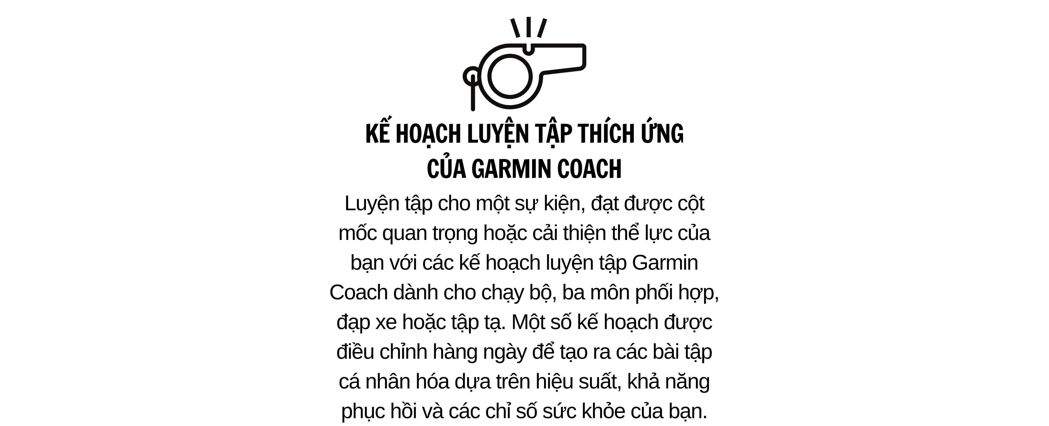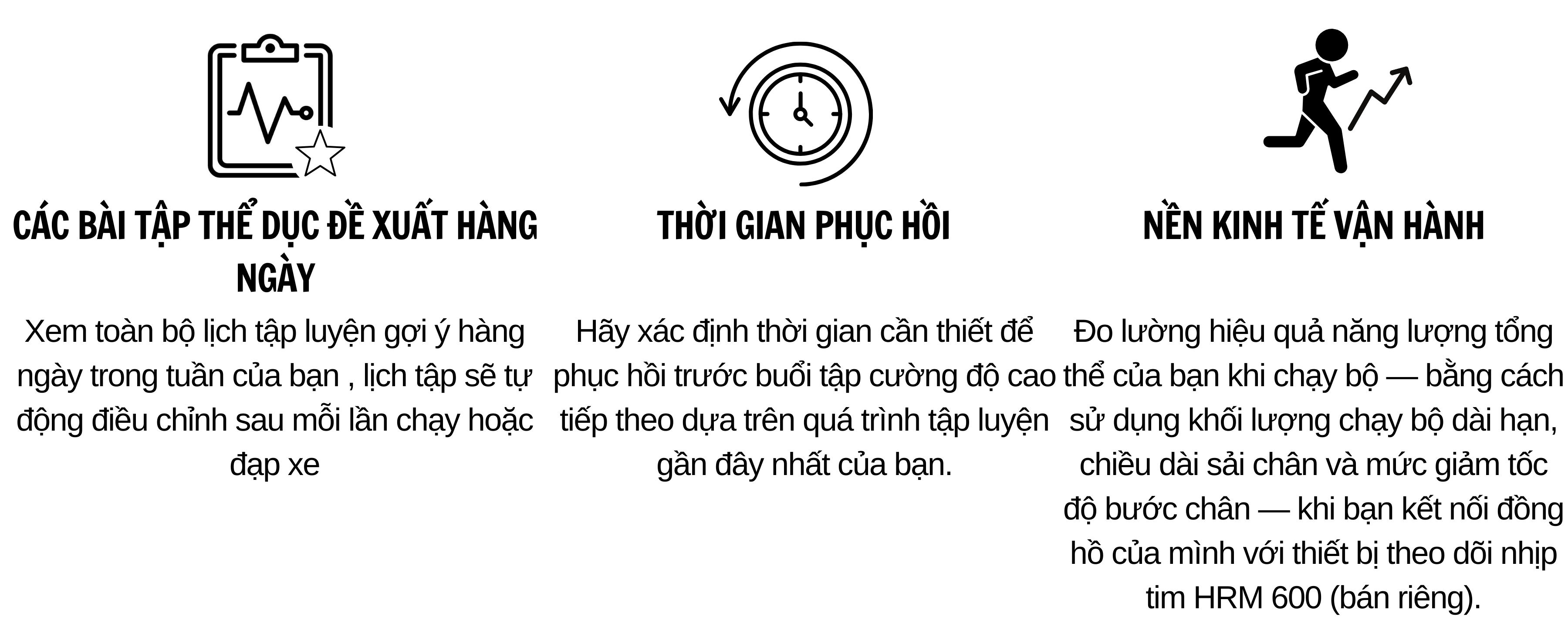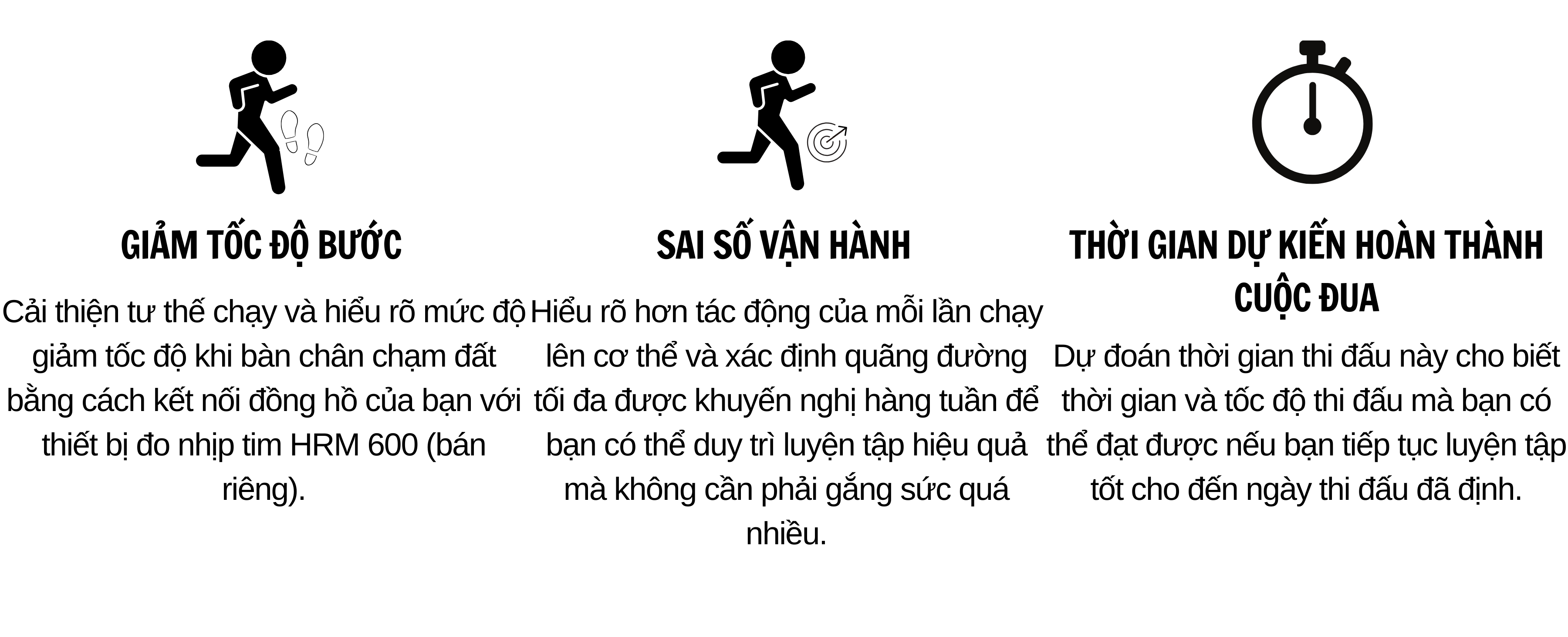 | Cảnh báo (kích hoạt báo động khi bạn đạt được các mục tiêu bao gồm thời gian, quãng đường, nhịp tim hoặc lượng calo) | ✓ |