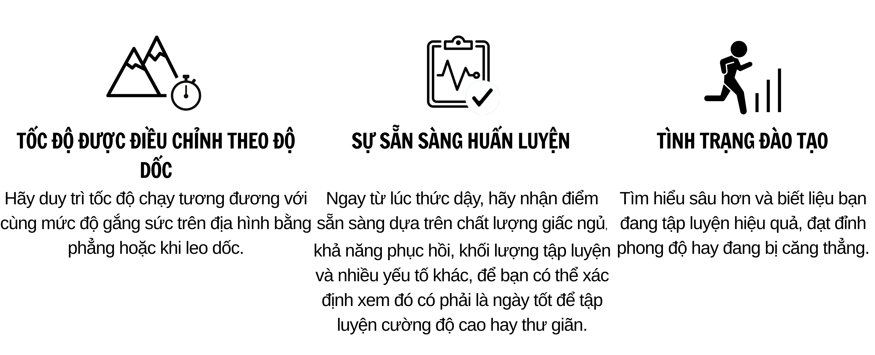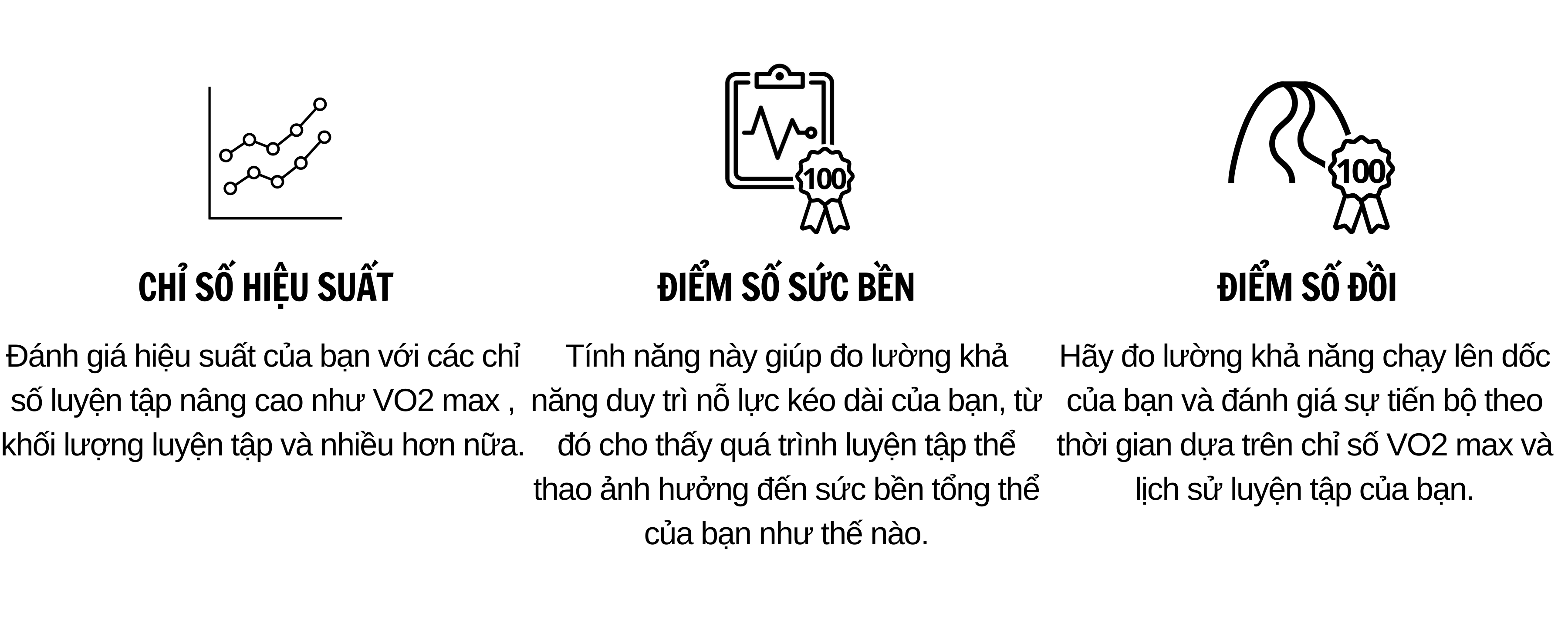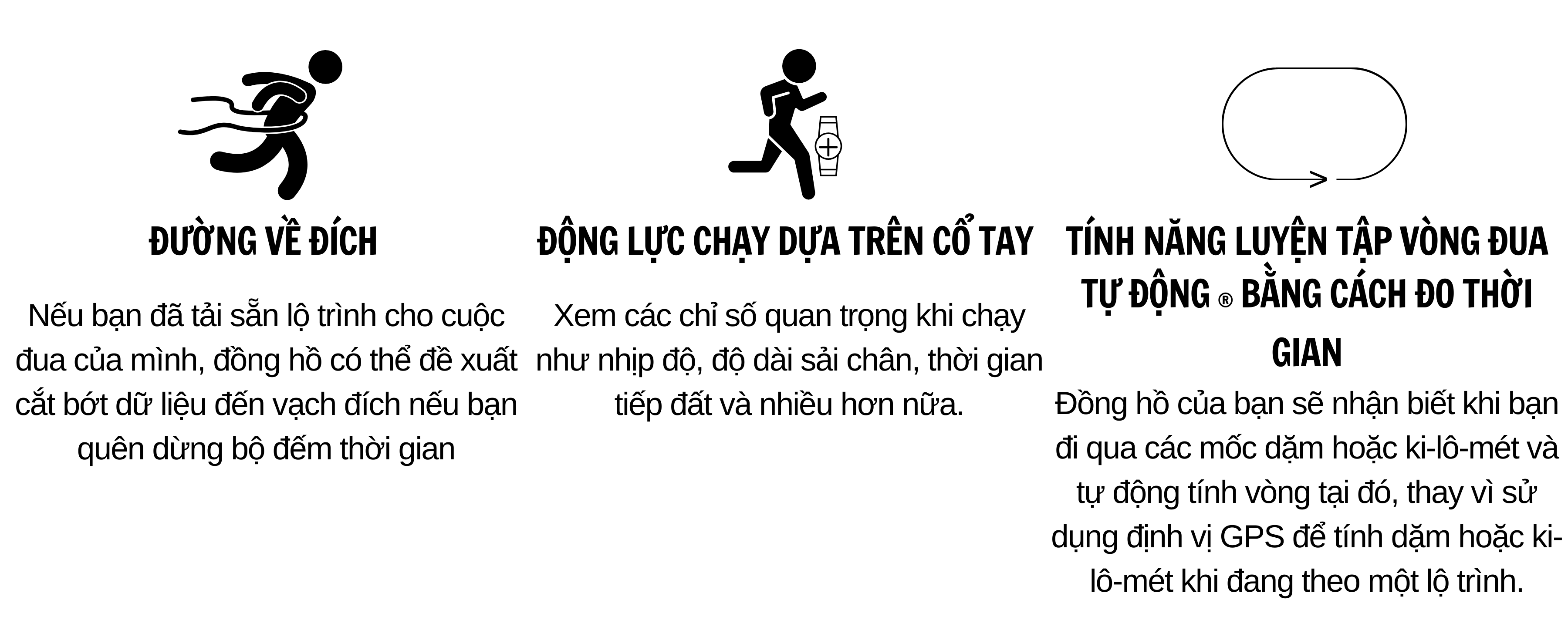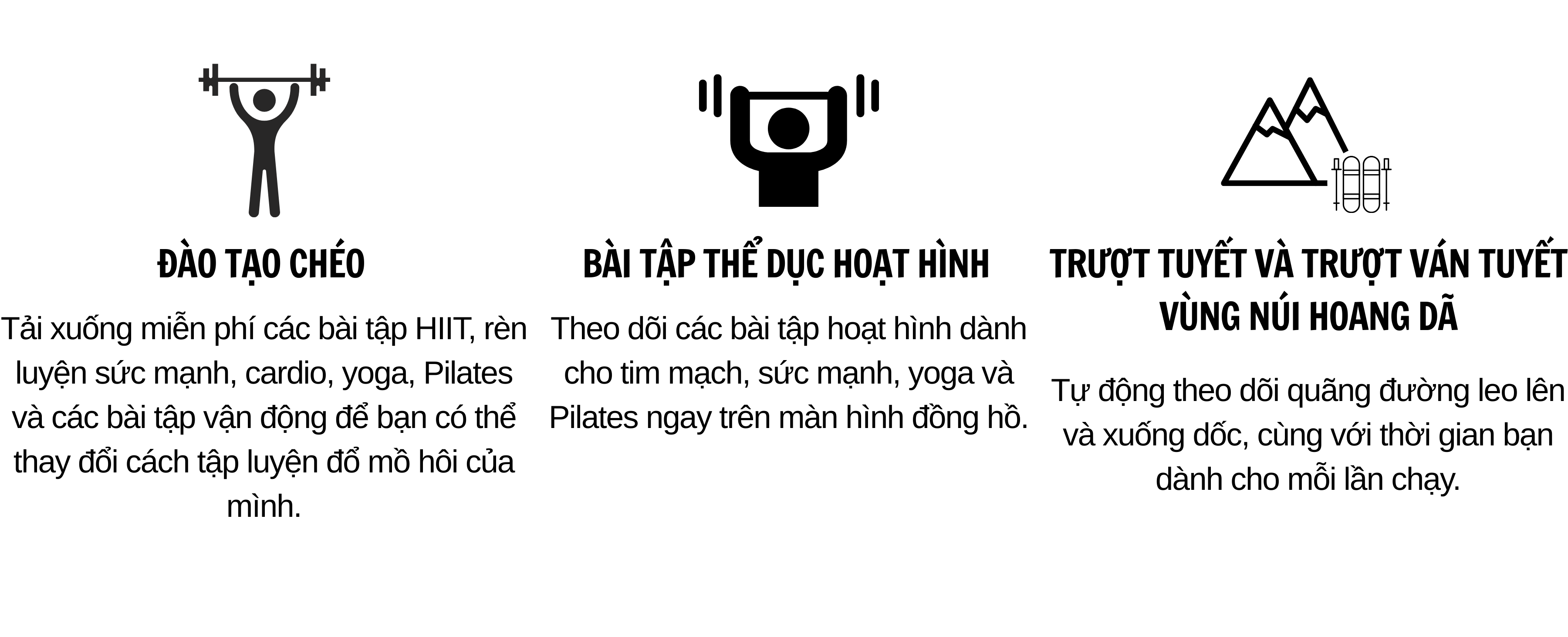 | Cảnh báo (kích hoạt báo động khi bạn đạt được các mục tiêu bao gồm thời gian, quãng đường, nhịp tim hoặc lượng calo) | ✓ |