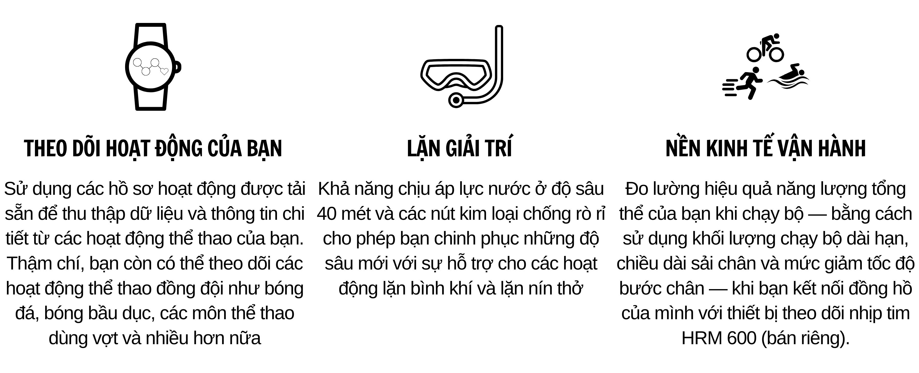 | Nhịp tim đo được từ thiết bị đo nhịp tim ngoài (thời gian thực trong lúc nghỉ ngơi, thống kê theo khoảng thời gian và phiên tập trong lúc nghỉ ngơi, và tự động tải xuống dữ liệu nhịp tim sau khi bơi). | Có (với HRM-Swim, HRM-Pro, HRM-Pro Plus hoặc HRM 600) |