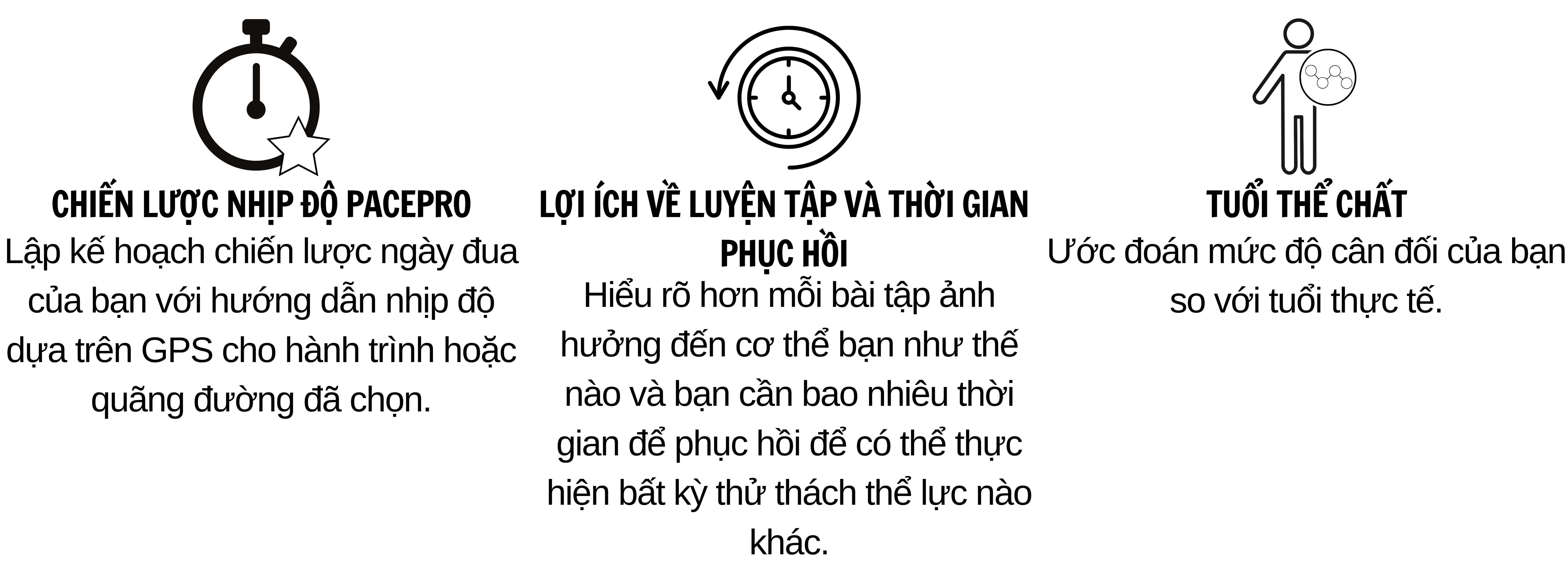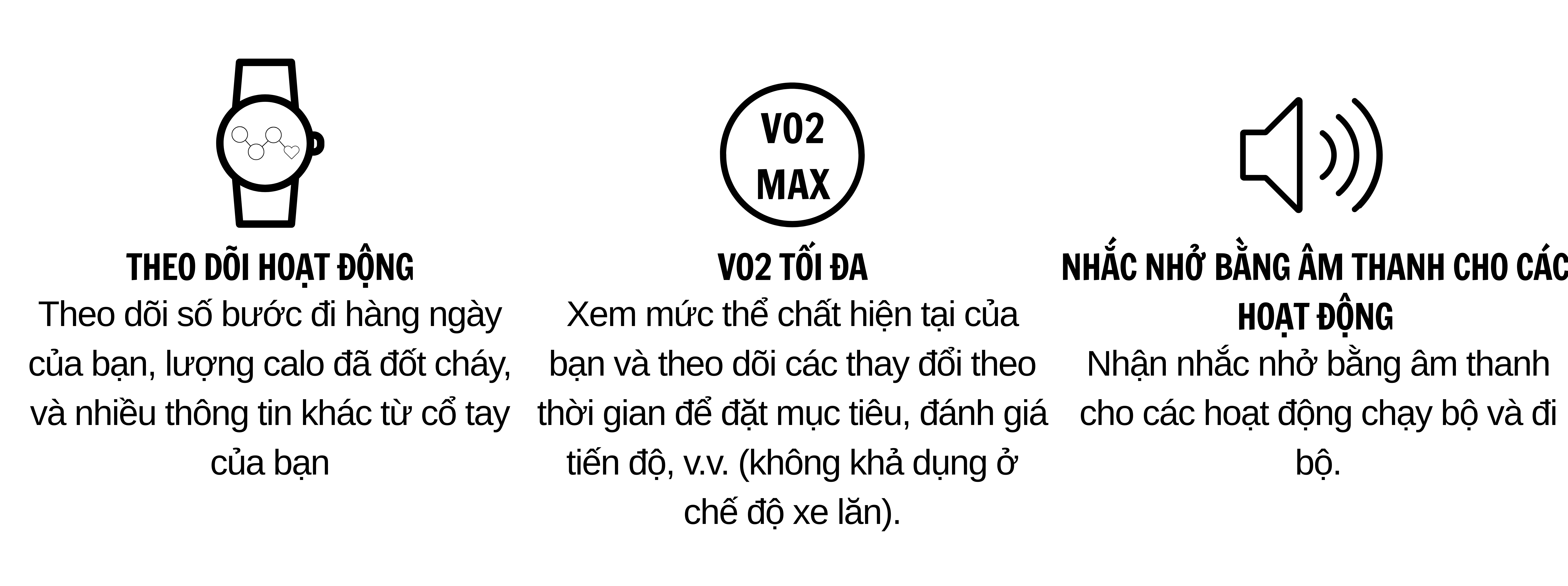 | CẢNH BÁO (KÍCH HOẠT BÁO ĐỘNG KHI BẠN ĐẠT ĐƯỢC MỤC TIÊU BAO GỒM THỜI GIAN, KHOẢNG CÁCH, NHỊP TIM HOẶC CALO) | ✓ |