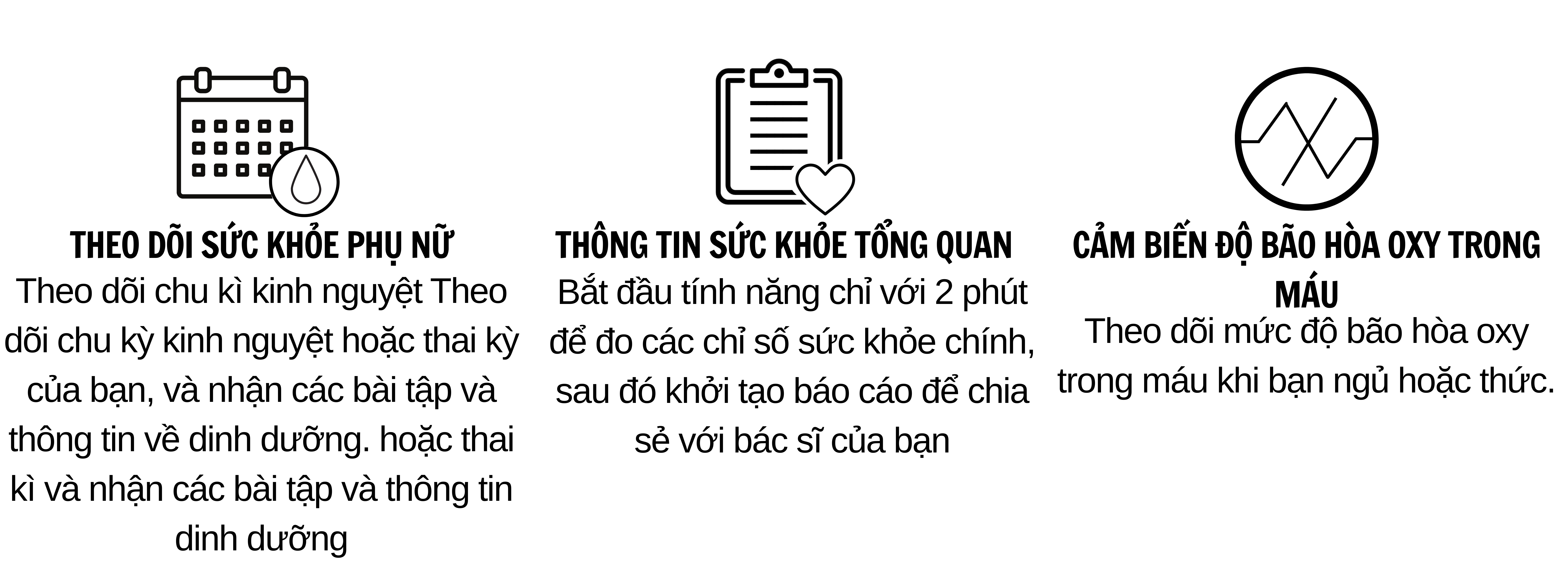 | ĐỘ BÃO HÒA OXY TRONG MÁU | Có (kiểm tra nhanh, và tùy chọn cả ngày hoặc khi ngủ) |