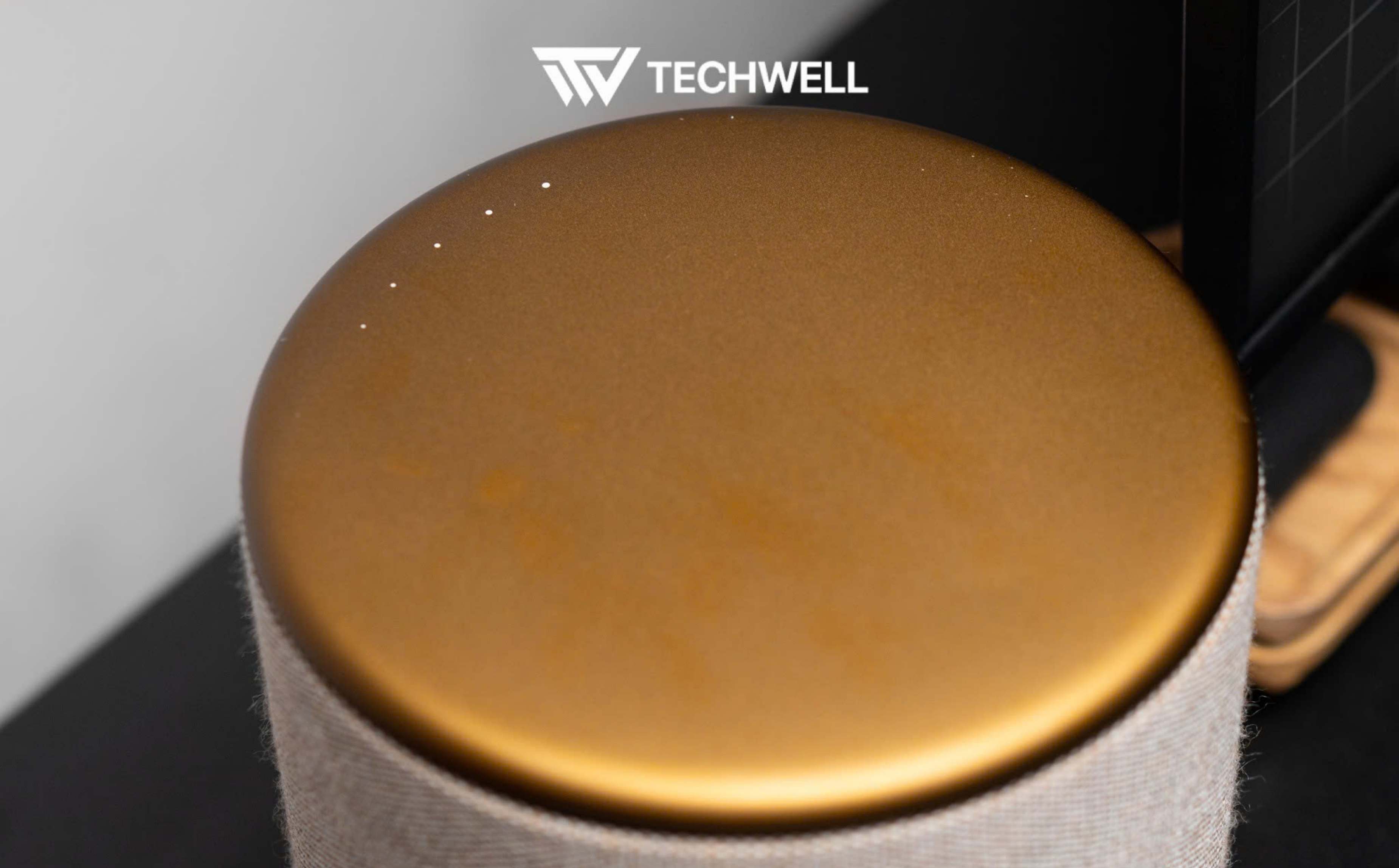 Mặt trên: Đĩa điều khiển được chế tác từ nhôm anode hóa (anodized aluminum) nguyên khối, tạo cảm giác mát lạnh và cao cấp khi chạm vào.