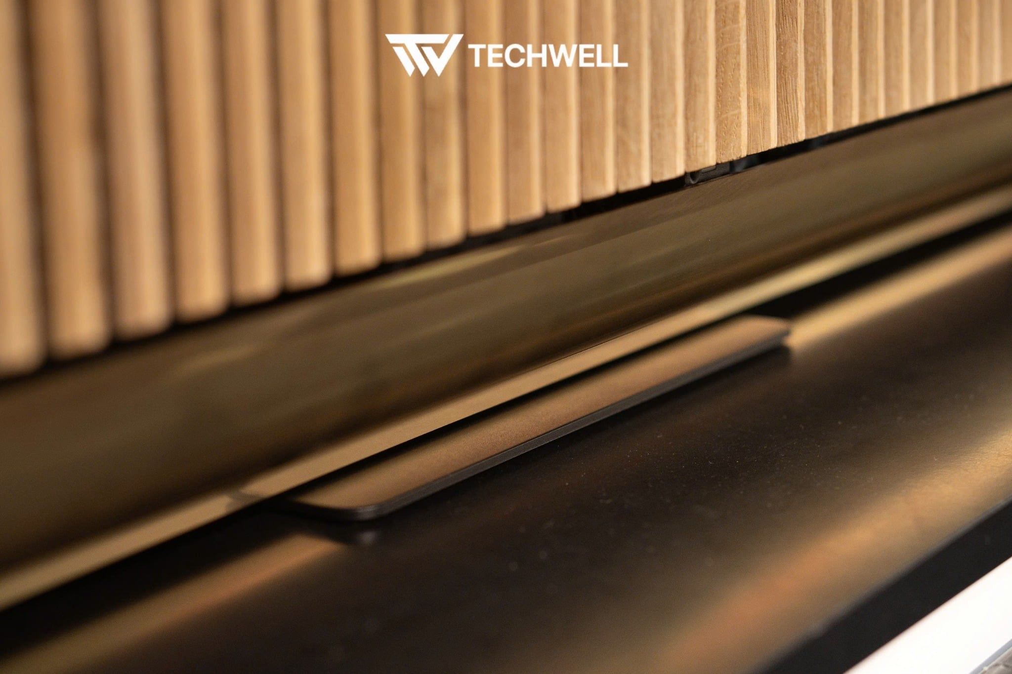 Sự linh hoạt tuyệt đối: Beosound Theatre được thiết kế để "tiến hóa" cùng bạn. Nhờ cấu trúc module, bạn có thể thay đổi kích thước cánh loa để phù hợp với các dòng TV từ 55, 65 đến 77 inch, giúp tổng thể bộ dàn luôn liền khối như một tác phẩm nghệ thuật duy nhất.