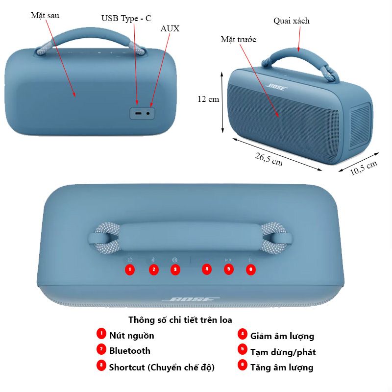 | Loa Bose SoundLink Max (CxRxS) | 12 x 26.5 x 10.5 cm (2.13 kg) |