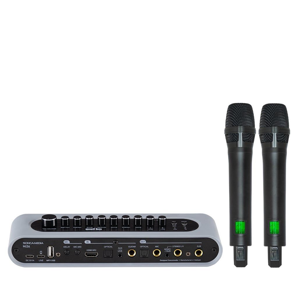 Soncamedia Mi36 tích hợp vang số DSP chuyên nghiệp cho phép tinh chỉnh âm thanh chi tiết, xử lý giọng hát trong trẻo, dày và đầy cảm xúc, đồng thời loại bỏ tạp âm hiệu quả. Người dùng có thể dễ dàng điều chỉnh echo, reverb hay cân bằng các dải tần để phù hợp với từng không gian và phong cách hát. Ngoài ra đối với người am hiểu về âm thanh, để có những tinh chỉnh chuyên sâu hơn thì chúng ta có thể tải ứng dụng SONCA Mixer.